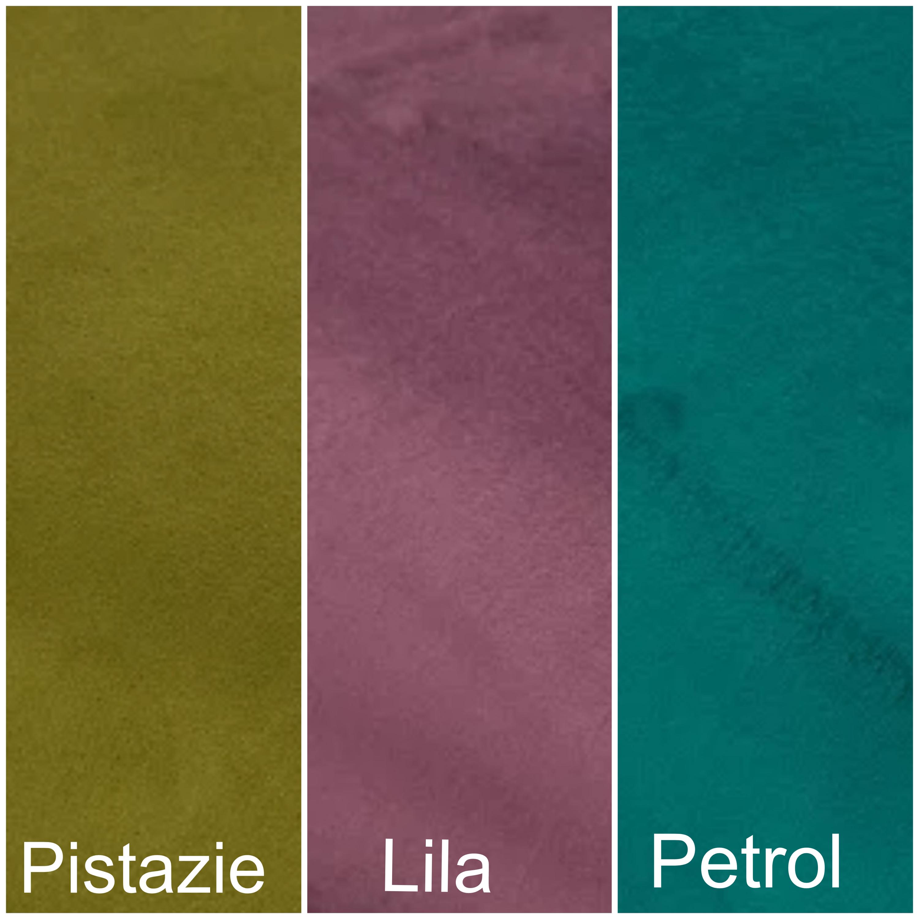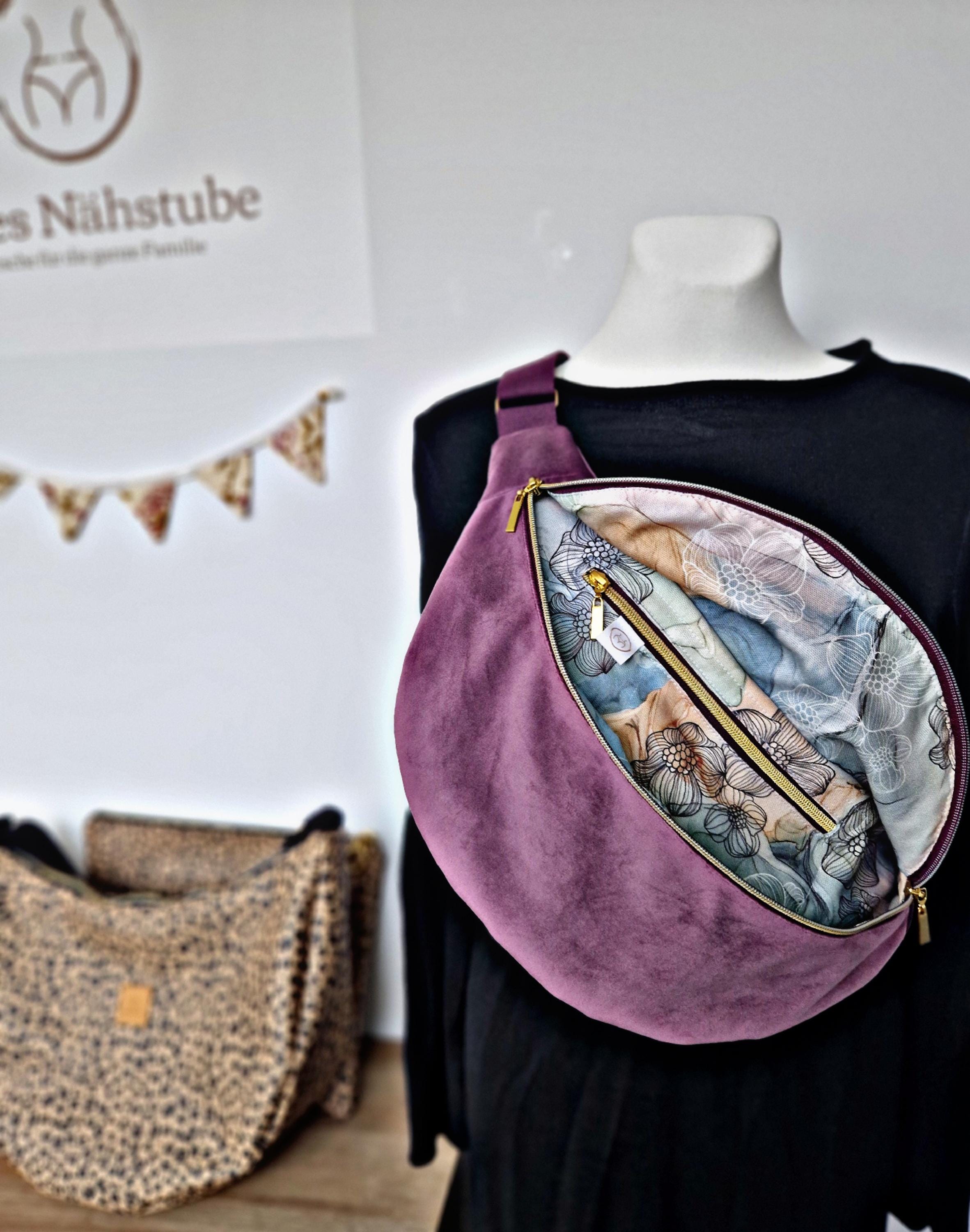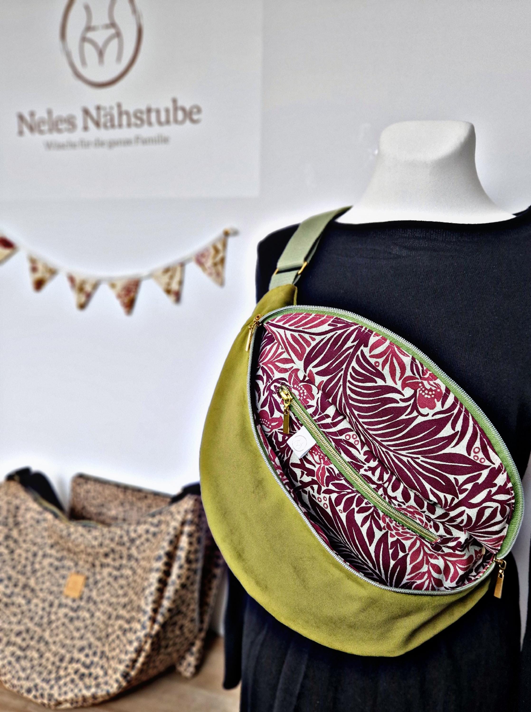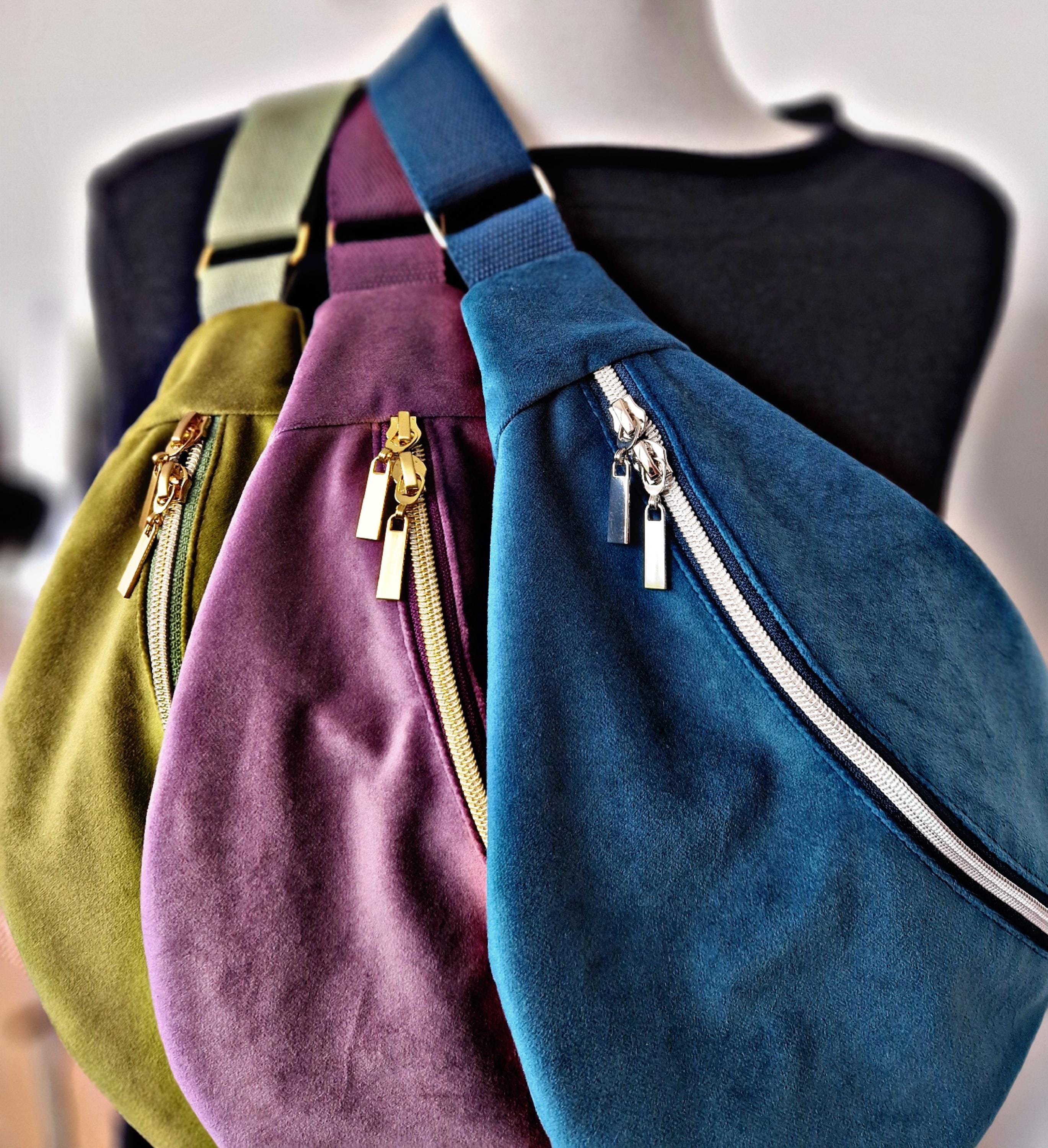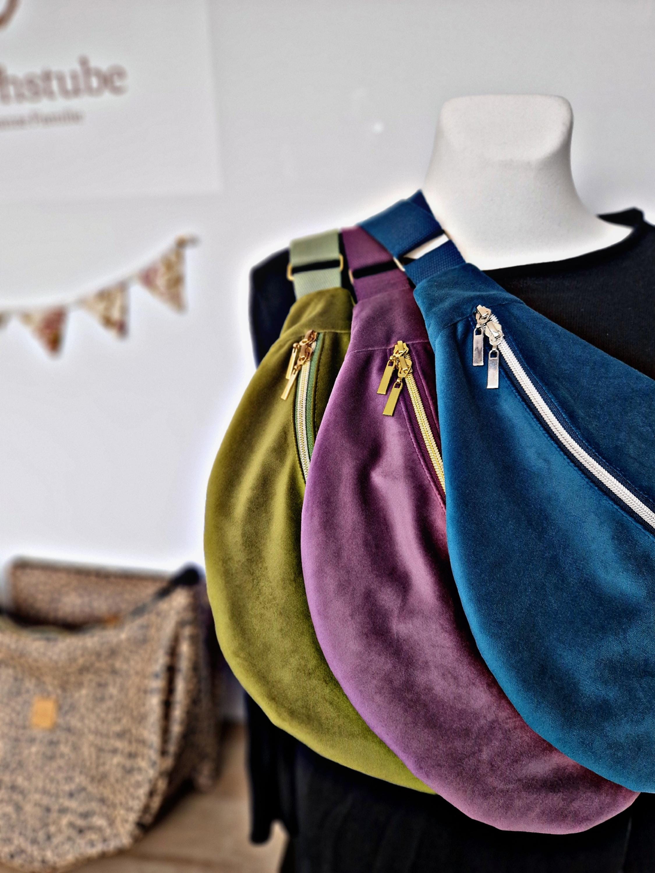 For the bags, I use three different lining fabrics: the pastel-colored fabric is for the purple bag, the red lining fabric is for the pistachio bag, and the petrol-colored bum bag is lined with blue canvas.