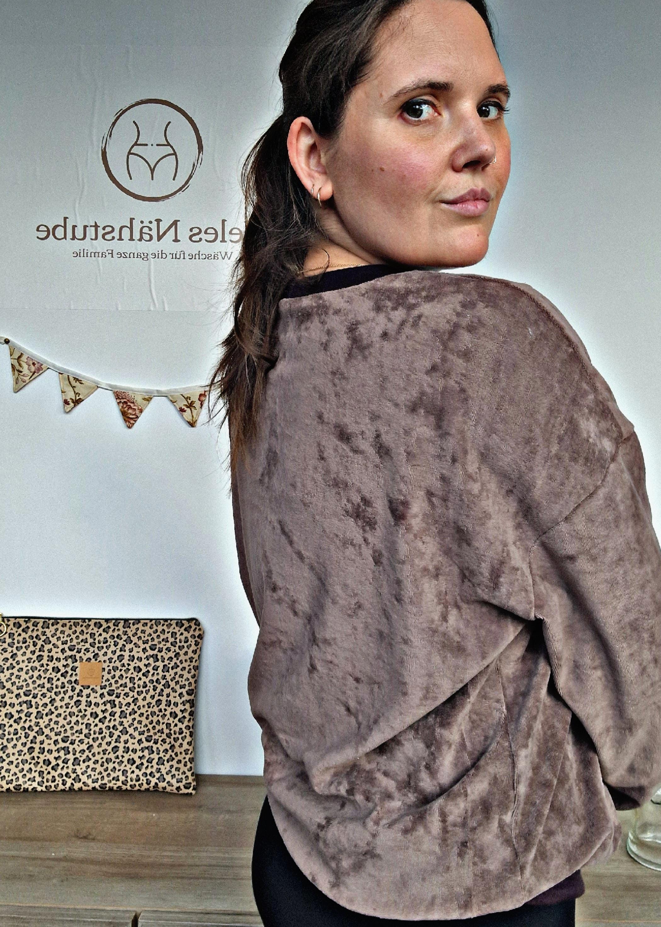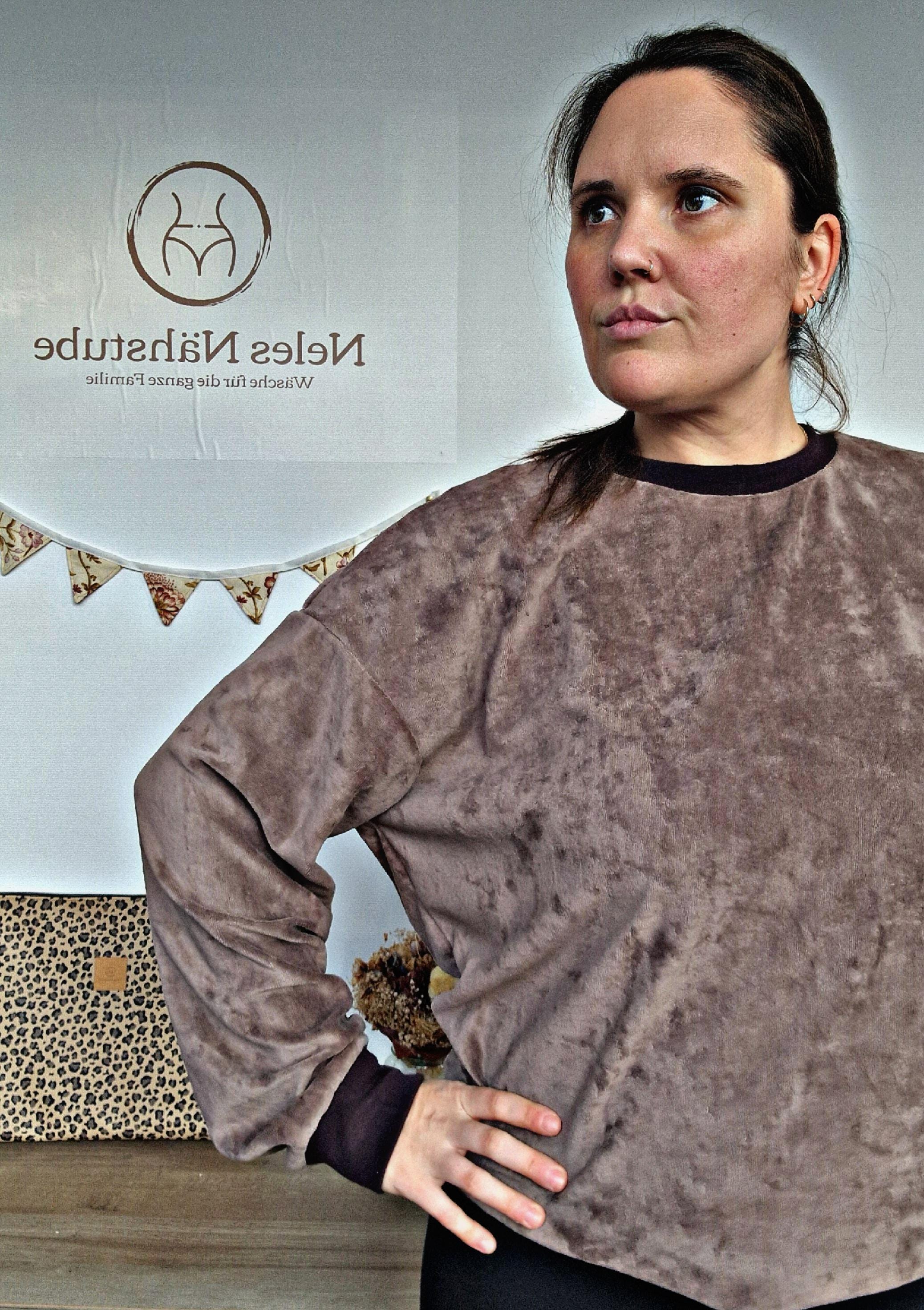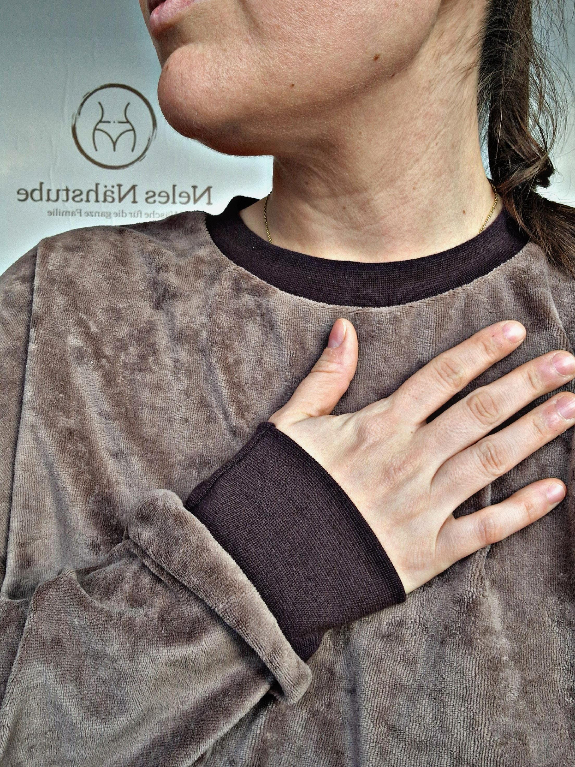 Cozy soft oversized sweater made of velour fabric in taupe, size 40.
